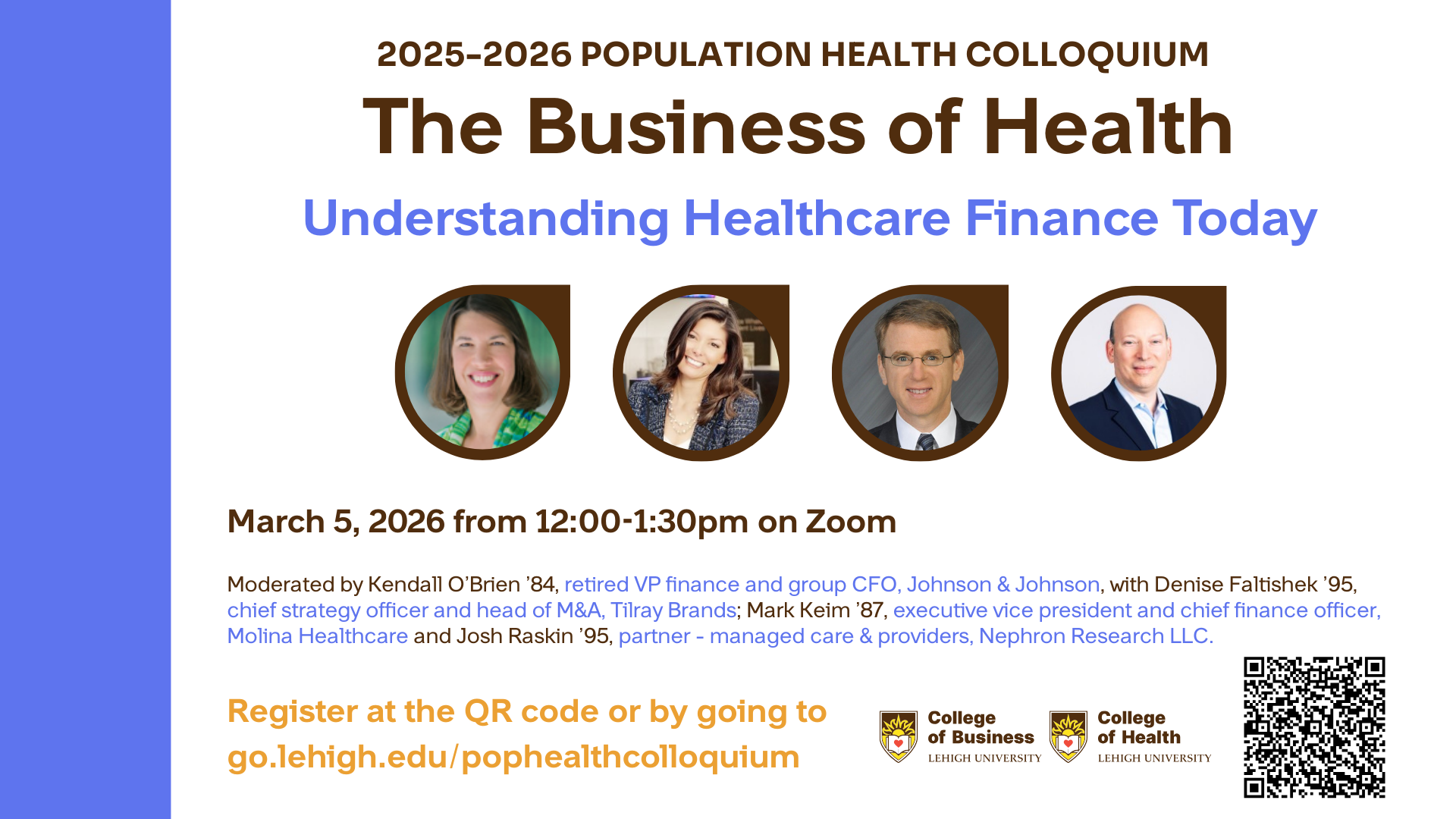 Guest speakers include Denise Faltishek ’95, chief strategy officer and head of M&A at Tilray Brands; Kristine Shira ’99, vice president of people at Optum; Mark Keim ’87, executive vice president and chief finance officer at Molina Healthcare and Josh Raskin ’95, research analyst at Nephron Research LLC.